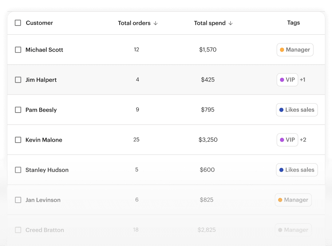 See a list of all your customers and create custom tags to segment them later. Say hello, personalization.